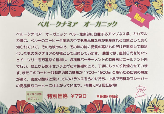 新たに入ったコーヒーは【ペルークナミア オーガニック】です。